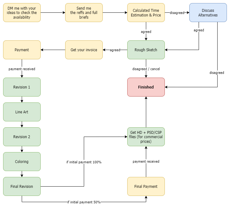 For clients that willing to order outside the platform should pay minimum 50% from total price after agreed with the sketch and 50% rest before I send you the high quality final piece. payment not limited if you wanted to pay 100% upfront.